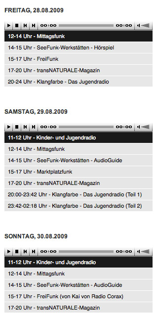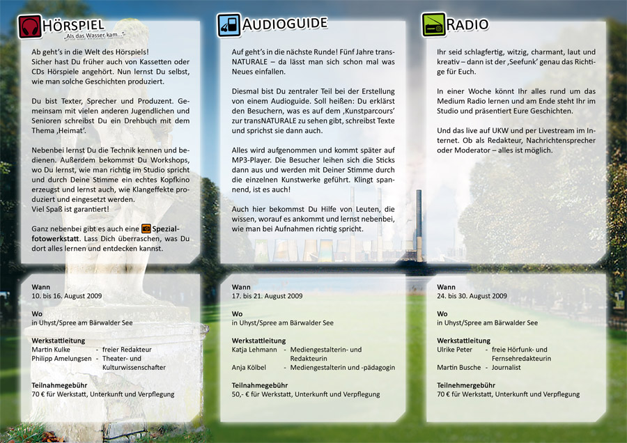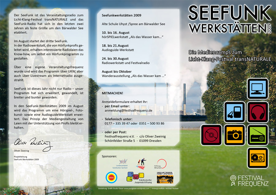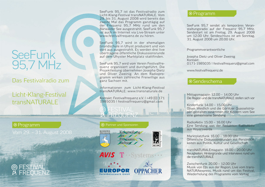 Der SeeFunk 95,7 war das Veranstaltungsradio zur transNATURALE in der Oberlausitz und hat sich in den vier Sendejahren als feste Größe um den Bärwalder See etabliert. Zum fünfjährigen Jubiläums-Licht-Klang-Festival war der SeeFunk nicht nur Radio. Das Programm hat sich gewandelt, ist breiter und bunter geworden. In den SeeFunk-Werkstätten 2009 im August wurde das Programm um eine Hörspiel-, Fotokunst- sowie eine Audioguidewerkstatt erweitert. Uns war es wichtig die Bewohner der umliegenden Ortschaften mehr in die Aktivitäten des Mediencamps einzubeziehen und somit auch in die Kunstvermittlung des Licht-Klang-Festivals.