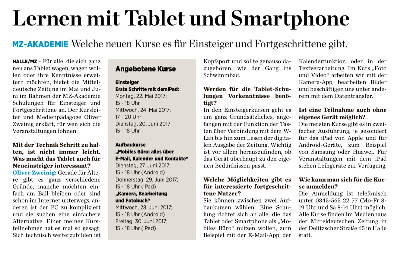 Die Mitteldeutsche Zeitung hat für alle Einsteiger und Interessierte im Juli 2014 die MZ-Akademie ins Leben gerufen und kultur & medien 21 mit medienpädagogischen Schulungen speziell für Einsteiger in iPad und Android-Tablet beauftragt. Hier wurden die Funktionsweisen der Geräte Schritt für Schritt erklärt. Eine Mischung aus wissenswerten Vorträgen und praxisorientierten Übungen erwartete die Kursteilnehmer. Für Fortgeschrittene bot die MZ-Akademie die Aufbaukurse Digitale Fotografie & Bildbearbeitung, Das mobile Büro, Kreative Fotogeschenke mit CEWE sowie Kurse für den Datentransport zwischen Geräten und Clouds an. Es haben mehr als 1.000 Teilnehmer und die Kurse besucht.
