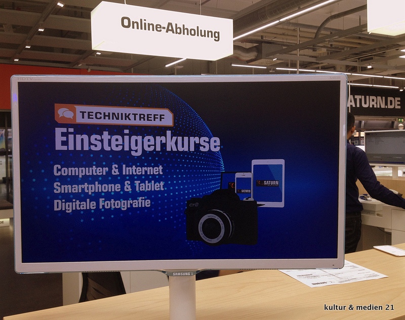 In Ingolstadt geht kultur & medien 21 neue Wege. Das Konzept Computerzeitalter 60plus wurde dahin gehend angepasst, dass Verkäufer zu Medientrainern ausgebildet werden. Gemeinsam mit der Marktleitung und den zukünftigen Medientrainern hatte ich unterschiedliche Kurse entworfen. Anschließend führten wir diese Angebote gemeinsam durch.