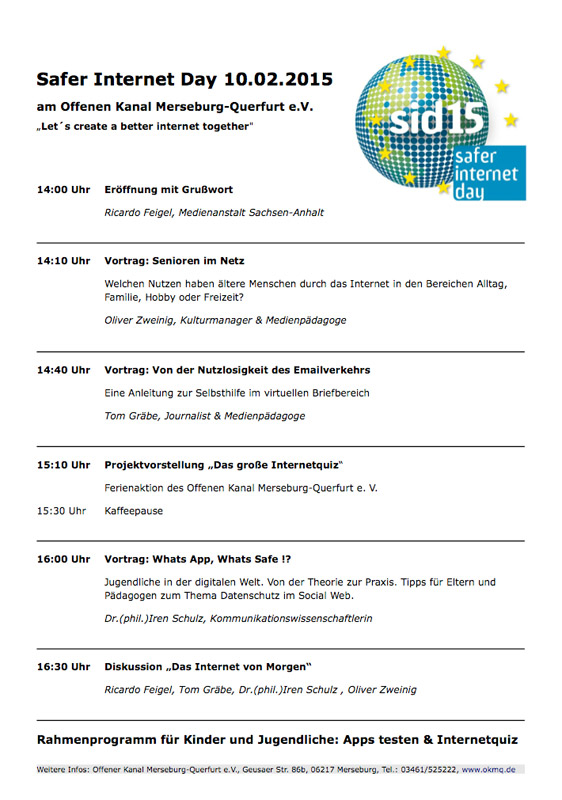 Jährlich findet der weltweite Safer Internet Day statt. kultur & medien 21 wurde vom Offenen Kanal Merseburg für den 10. Februar 2015 eingeladen einen Vortrag über die Internetnutzung älterer Erwachsener zu halten. Das Thema hieß ‚Internet der Generationen – Senioren im Netz’ und war Teil der Livesendung des OK. Neben den Erfahrungen aus den Medienkursen von Computerzeitalter 60plus, den Senioren-Computer-Clubs in Halle und der Netzwerktagung ‚Fit im Alter – fit in Neuen Medien’ wurde auch eine überspitzte Umfrage (siehe in diesem Artikel) unter älteren Erwachsenen über die Internetnutzung Jugendlicher dargestellt.